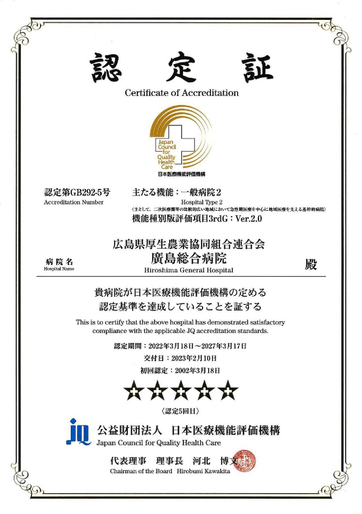平成29年3月18日付けで、病院機能評価に係る一般病院2(500床以上)(主たる機能)での認定病院となりました。
