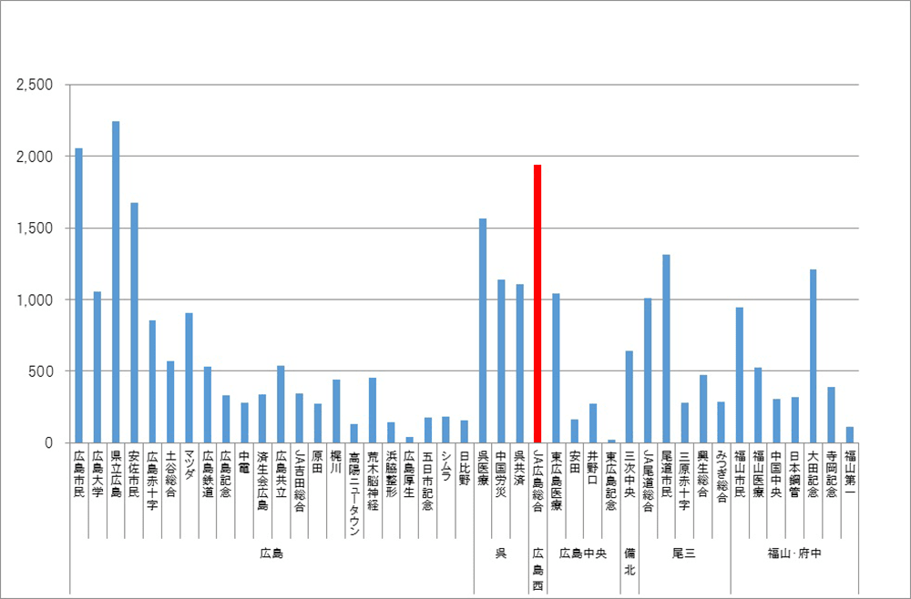 広島総合病院の集中治療室は8床で構成されています。一方、職員は2名の専従医師、11名のスタッフ医師、13名の医療工学士、29名の看護師及び1名の看護助手が配置されています。