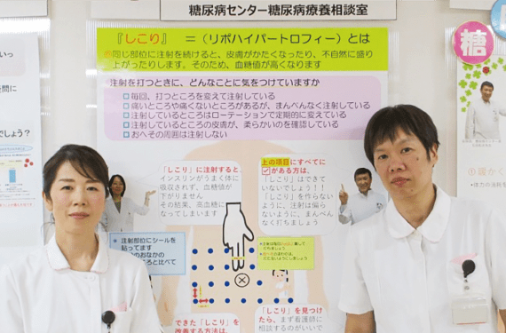 私たちは糖尿病患者さんが、健康な人と変わらない生活ができるように、治療をサポートします。注射や内服治療、フットケア(足の手入れ)、運動療法などを説明します。糖尿病を少しでも良い状態にできるよう普段の生活で、できることを考えていきましょう。