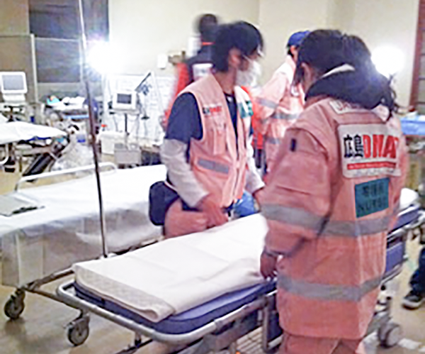 DMAT(Disaster Medical Assistance Team)とは、大地震や航空機・列車事故といった災害時に被災地に迅速に駆けつけ、救急治療を行うための専門的な訓練を受けた医療チームです。JA広島総合病院は2チーム10名のDMAT 隊員がおり、有事に備えさまざまな訓練を積み重ねています。