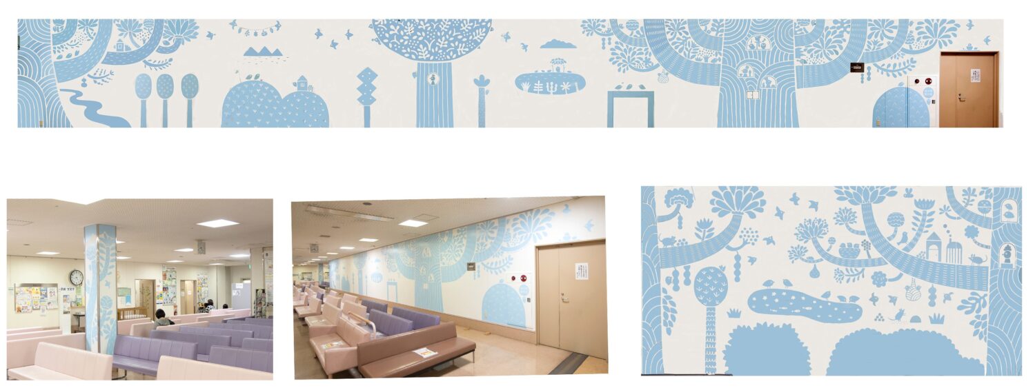 童話から抜け出してきたようなこれらの絵柄と彩りは、病院というややもすれば無機質で居心地の悪い空間にぬくもり、やさしさ、和やかさを生み出し、辛い思いをして受診される患者さんに癒しと憩いを与えてくれることでしょう。