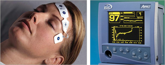 今日ではさらに安全にという観点で改良を続けられ、人工呼吸器も集中治療室レベルの高機能なものが組み込まれています。患者さんの生体情報(血圧、心電図、パルスオキシメーター、麻酔ガス濃度など)のみならず、脳波(写真2)、麻酔薬を投与するポンプなどの情報も統合されています。まるで旅客機のコックピットのようで、麻酔ワークステーションと呼ばれています(写真3)。