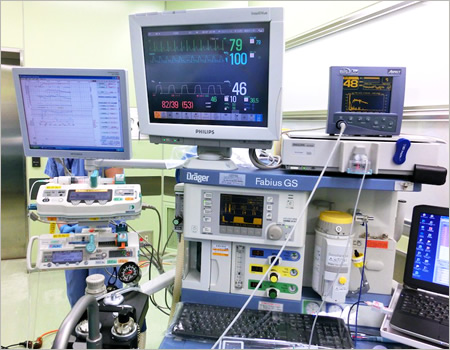 バイタルサインモニター(中央上)を中心に、麻酔器(下)、脳波モニター(右上)、麻酔記録システム用のディスプレー(左上)、麻酔専用のポンプ(左下)電子カルテ端末(右下)があります。