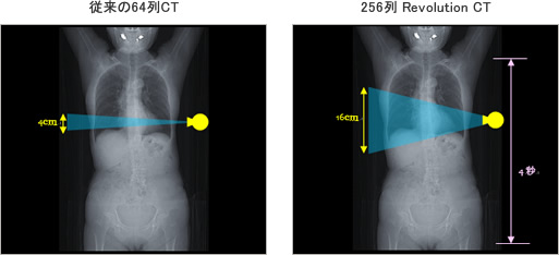 これまでの64列CTでは1回転して撮影できる範囲が4cmだったのに対し、256列Revolution CTでは4倍の16cmが撮影可能となりました。これにより撮影時間が大幅に短縮され、頭部撮影で1秒、胸部から骨盤部撮影であれば4秒以内で撮影できます。