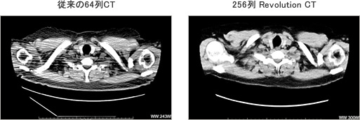 256列Revolution CTには少ない放射線量でも高品質の画像を得ることができる機能があります。同じ少ない放射線量で画像を比較した場合、従来の64列CTより256列Revolution CTの方が、きれいな画像を得ることができます。