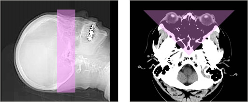 また、放射線の影響を受けやすい領域への被ばくを下げる機能(ODM)も搭載されています。 例えば、眼の水晶体へODM(ピンク色)を設定した場合には、画像クオリティーを下げることなく、最大で約30%の放射線量を自動で減らすことができます。