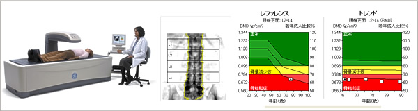 現在、様々な骨量測定法がありますが、最も信頼の高い骨量測定法であると推奨されているものにDEXA (Dual Energy X-ray Absorptiometry) 法を用いた骨密度測定装置があります。当院ではこのDEXA法を用いた骨密度測定装置(PRODIGY:GE横河メディカル社製)で腰椎と大腿骨を測定し、高精度を保ちながら、高速撮影、被ばく量の低減を実現した検査を行っています。