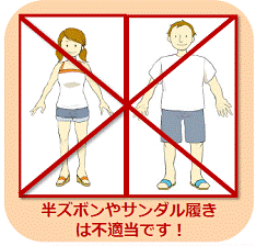 - ・長そで、長ズボンなど肌をなるべく出さない服装をする(すそは中に入れ込む)